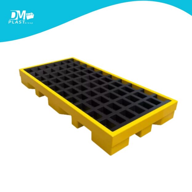 La superficie superior cuenta con rejilla acanalada para la recolección de líquidos derramados, y la base está diseñada para facilitar su desplazamiento mediante montacargas. Ideal para industrias químicas, alimentarias, automotrices o almacenes que buscan una solución eficaz para el manejo seguro de fluidos.